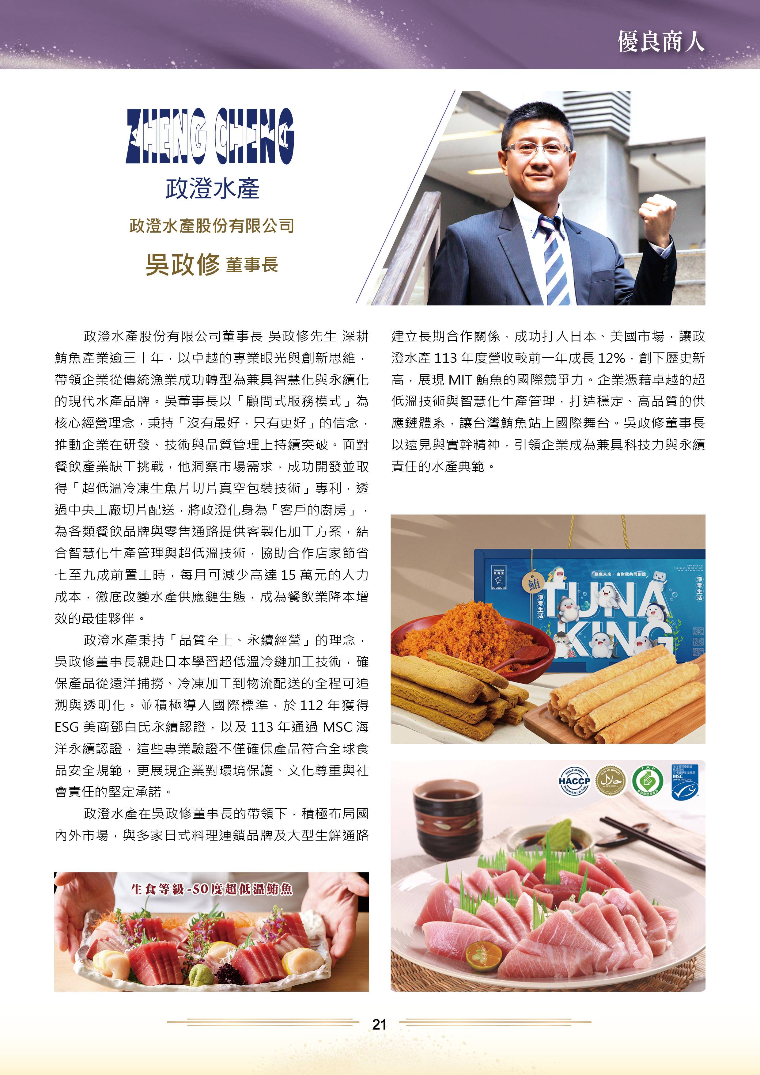 魚有王(政澄水產)榮獲經濟部第79屆金商奬 我司致力於品質至上、永續經營的理念 使用日本超低溫冷鏈加工技術,確保產品從遠洋捕撈、冷凍加工到物流配送,全程都是低溫環境,確保商品品質。並導入可追溯系統讓食品安全透明化。 未來我們會更展現企業對環境保護、文化尊重與社會責任的堅定承諾。